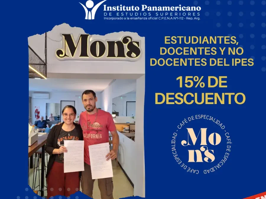 Los estudiantes, docentes y no docentes del Instituto Panamericano de Estudios Superiores (IPES) ya pueden disfrutar de un 15% de descuento en MON’S CAFÉ, una de las cafeterías más lindas de la ciudad, que acaba de inaugurar una nueva sede a la vuelta del IPES (Gral. Conrado Villegas 167, Neuquén).